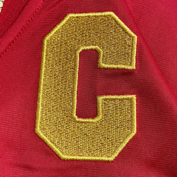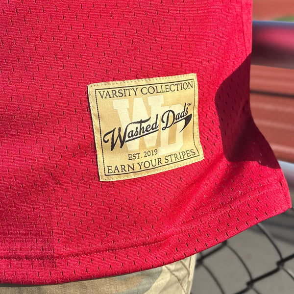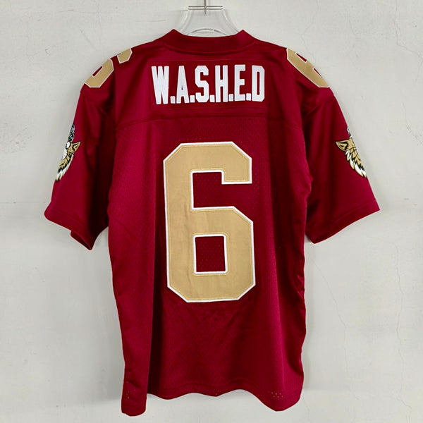 Carmine Red football jersey features a White embroidered Washed Dads, an Old Gold & White outlined embroidered 6, a woven patch at the bottom, an Old Gold captain's C patch on the chest and an Old Gold & White trophy patch on the front. A White W.A.S.H.E.D nameplate and Old Gold & White embroidered 6 on the back. Old Gold & White embroidered 6 on both upper shoulders and White, Black, Yellow & Red Mascot tiger logos on both sleeves.