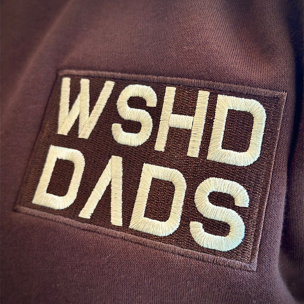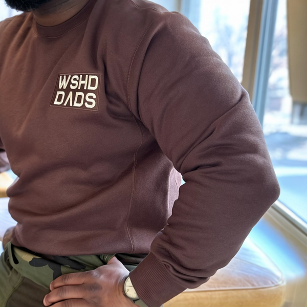 Mahogany Brown crewneck with a Cream logo design embroidered on the left front chest area